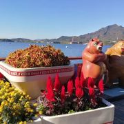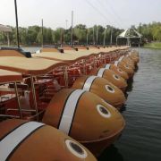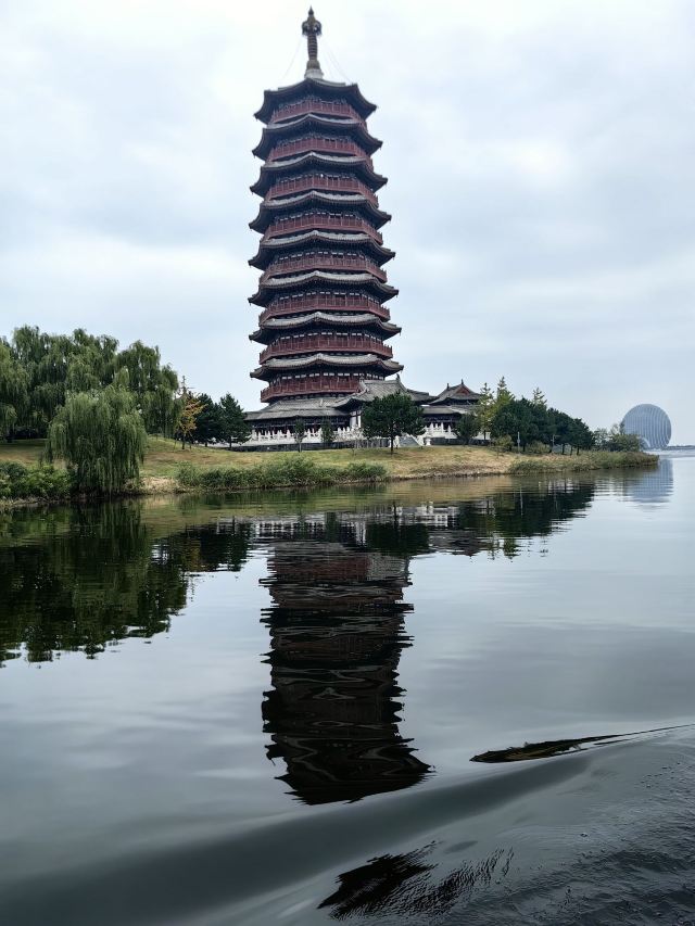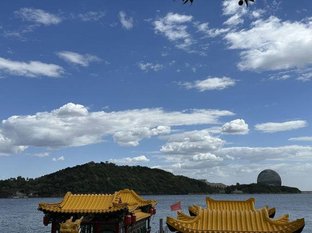 1️⃣游船:乘坐游船,欣赏雁栖湖的全景。游船分为多种类型,有龙舟、画舫等,单独购票90元,每40分钟发船一班,若人多则满员即发,我们坐的是龙舟,因将近中午,船上只有5人。