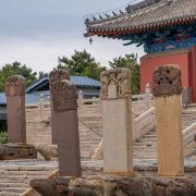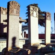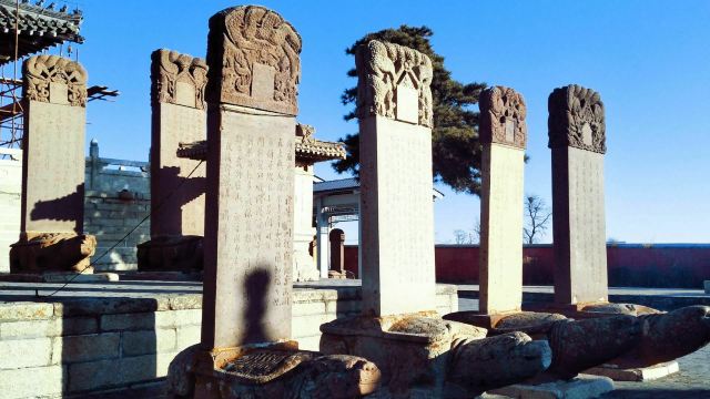 💫穿过神马殿,可看到四座碑亭一字排开,错落有致(图1)。这四座碑亭内藏有四块清代御碑,是康雍乾三代清帝祭祀北镇山的见证。但碑亭曾损坏严重,内部石碑也在七十年代被拉到摔断,字迹略有涣散。