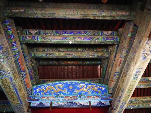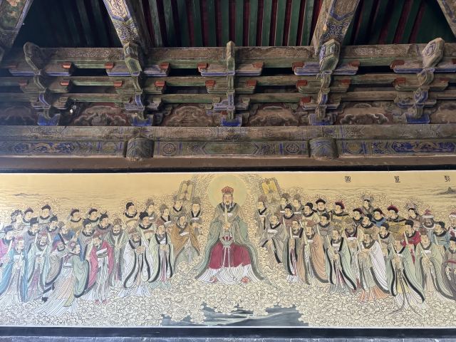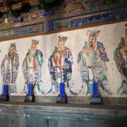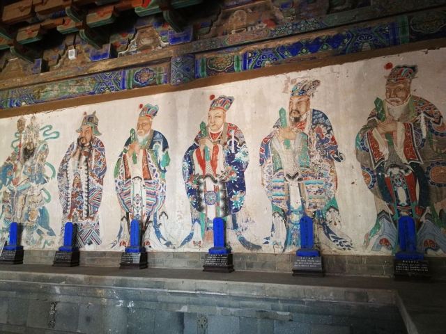 💫大殿面阔五间,进深三间,单檐歇山顶。这座殿堂内的广宁王塑像为近年重塑,但殿四周的明朝三十二功臣壁画,虽然在八九十年代经历了一定程度的修复,但大体上保持了清代壁画的风貌。且以真实的功臣画像作为主题,在众多庙宇壁画当中是罕见的(图13-16)。这里还藏有一些元代碑刻。