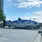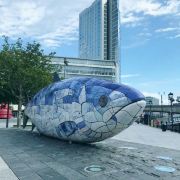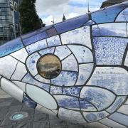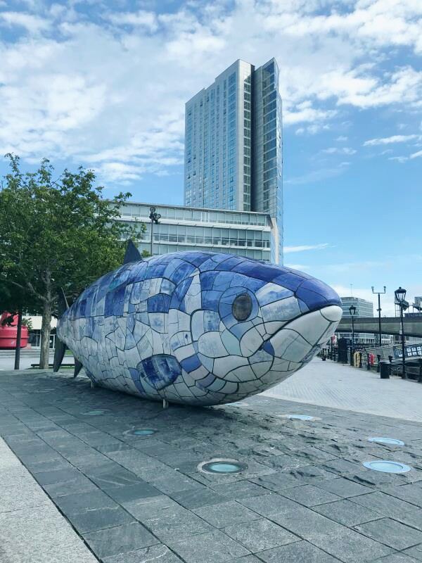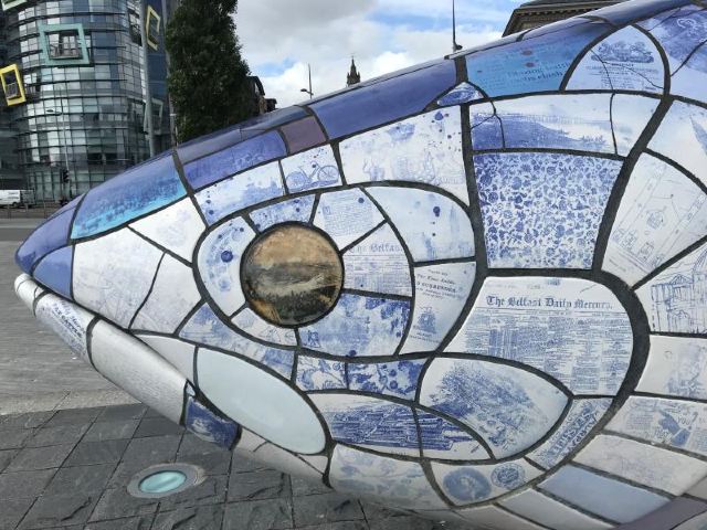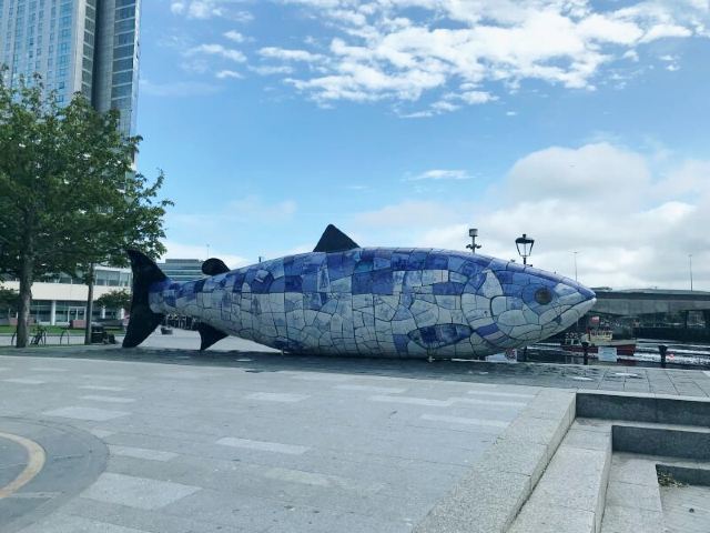 The Salmon of Knowledge (The Big Fish)是一座雕塑,雕塑表面镶嵌着成千上万个五颜六色的陶瓷片,上面展示了各种自然图案和城市景观。