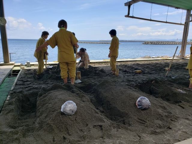 这个砂汤的场地足够让10名以上的游客共同入浴,堆砂阿姨都很热情,会向各地游客学习问候的语言,如果客人觉得舒服,可以适当延长被埋时间。