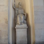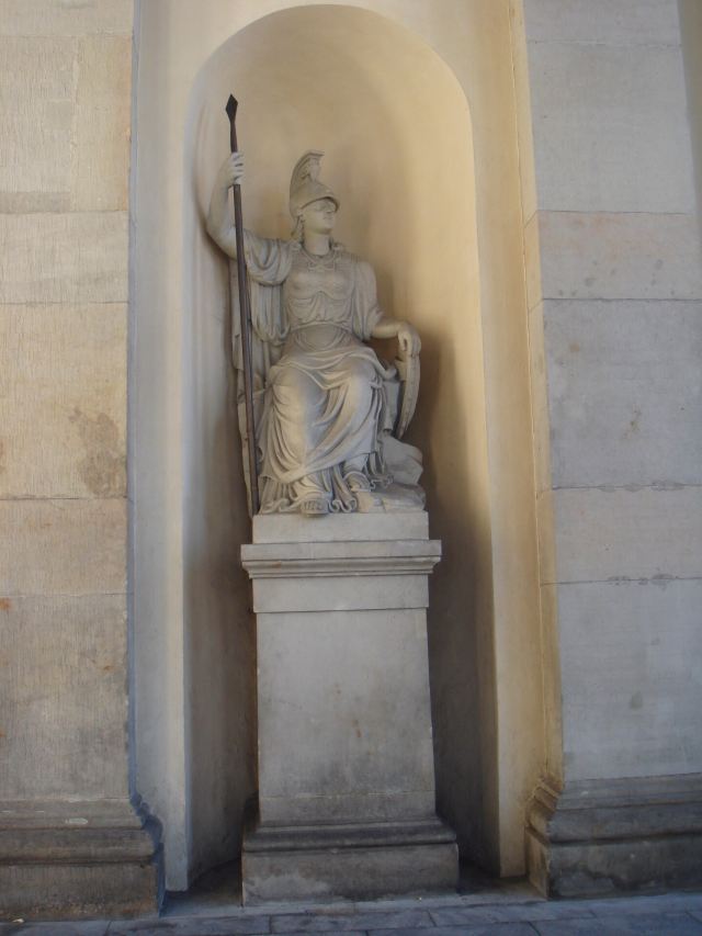 大门内侧墙面用浮雕刻画了罗马神话中伟大的英雄的海格力斯,战神玛尔斯,艺术家和手工艺人的保护神米诺娃。另外,与勃兰登堡门楼相连的南北两边翼房曾用于守卫和关卡,柏林城墙拆毁后被改建成敞开的立柱大厅,以便和勃兰登堡门的风格相一致。