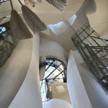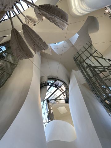 博物馆入口处的中庭,被设计师盖里称为“将帽子扔向空中的一声欢呼”,层叠起伏的曲面创造出打破一切秩序的冲击力,流动的光影令人目眩。