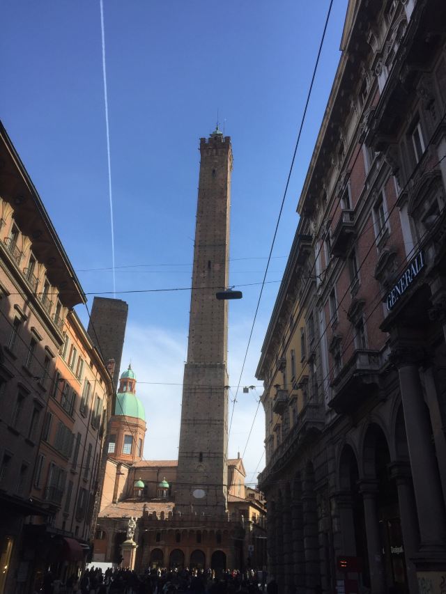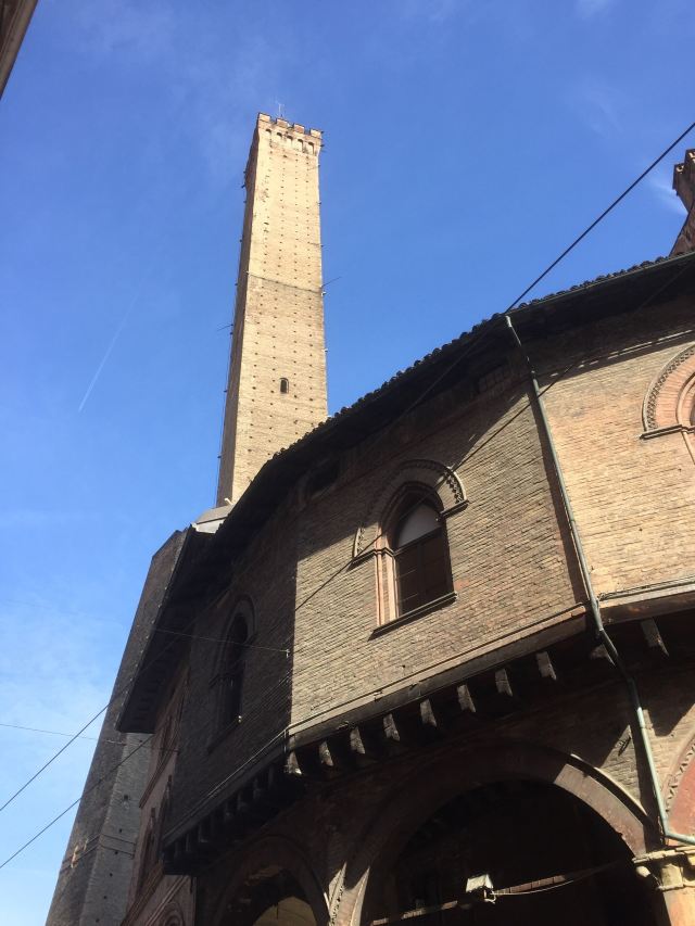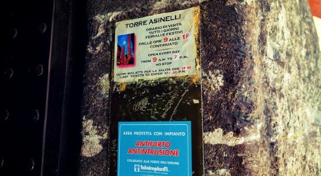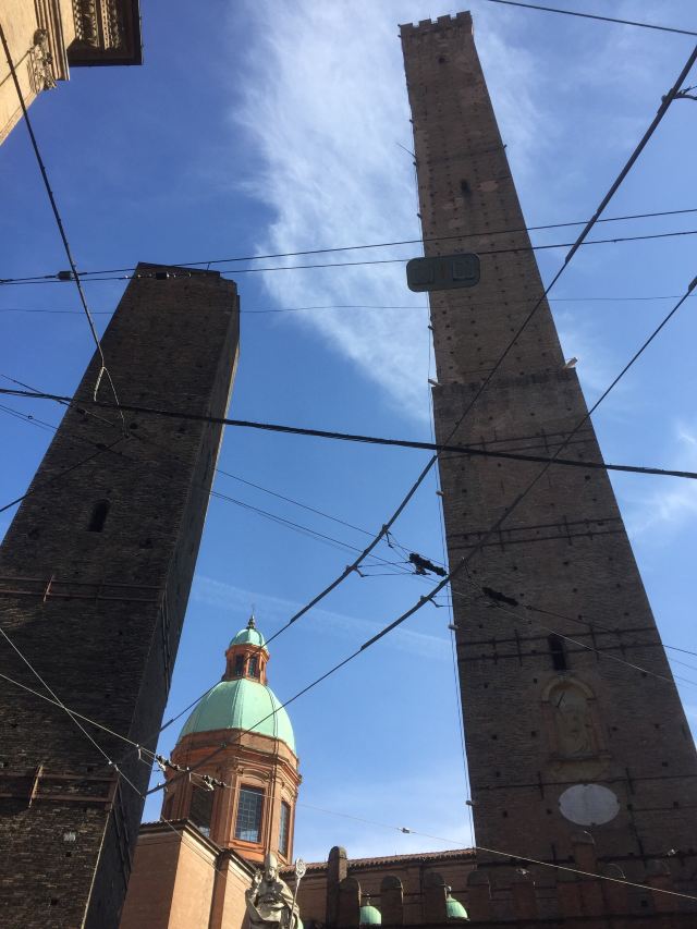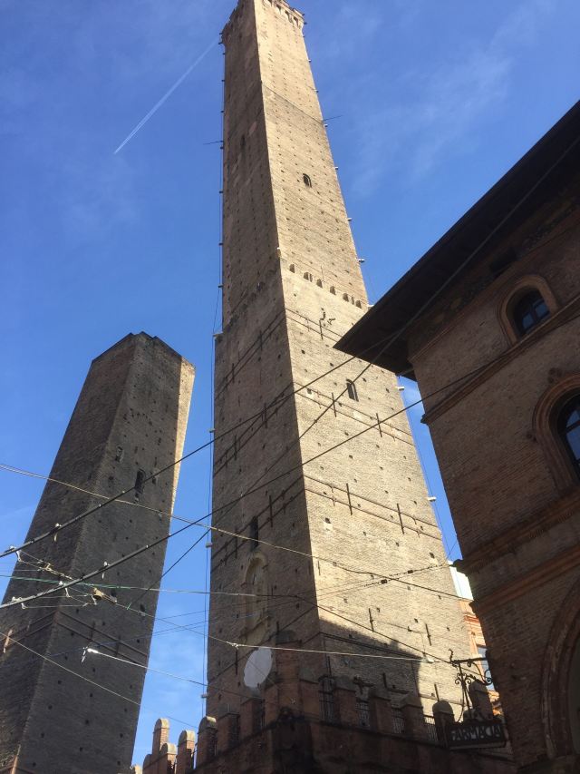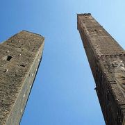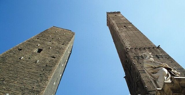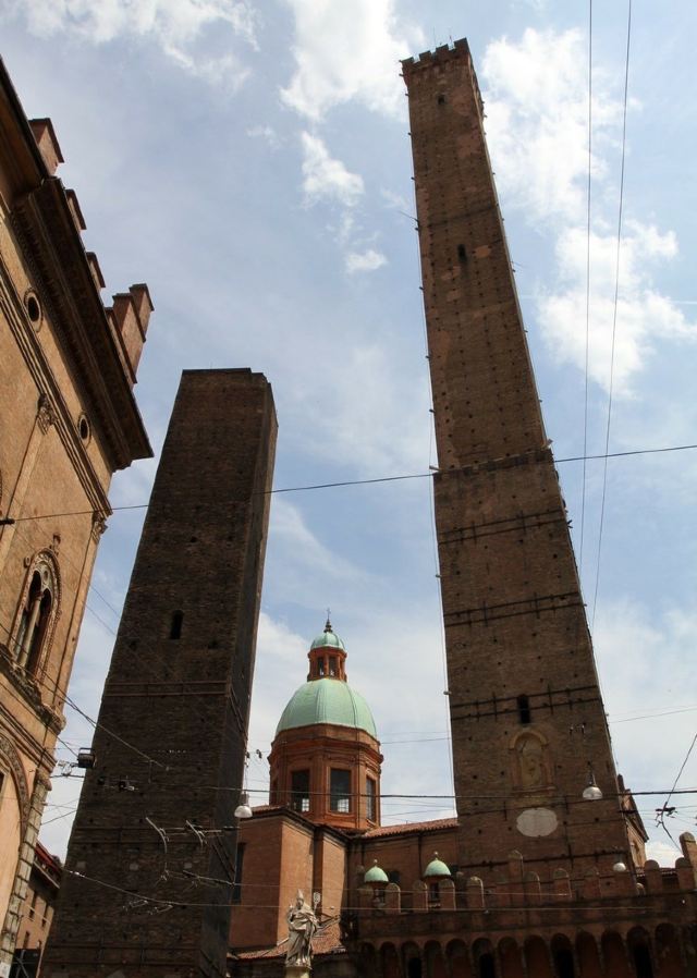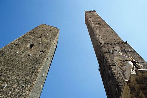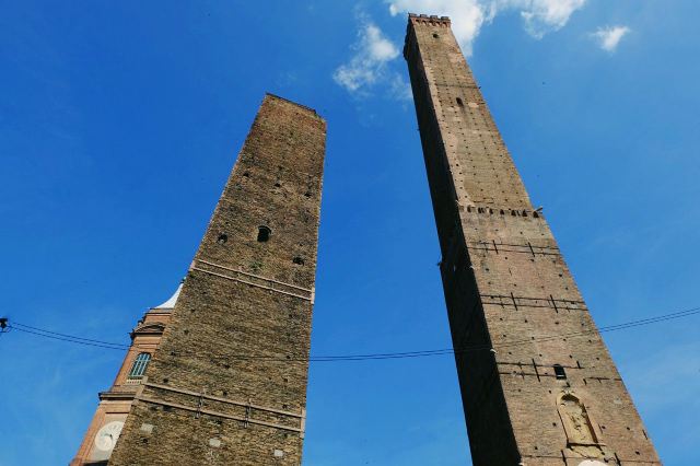 比较高的一座名叫“Torredegli Asinelli”,而旁边较低且倾斜的是“Torre Garisenda”。两座塔都建于中世纪1169年,是当时两家实力相当的贵族-加里森达家族和阿西内利家族为争夺对城市的领导权而建造的。结果前者的塔因为地基不稳发生垮塌,只有48米高,而倾斜度足有4.0°,比著名的比萨斜塔更斜;後者的塔则有97米高,是意大利现存的第四高塔。