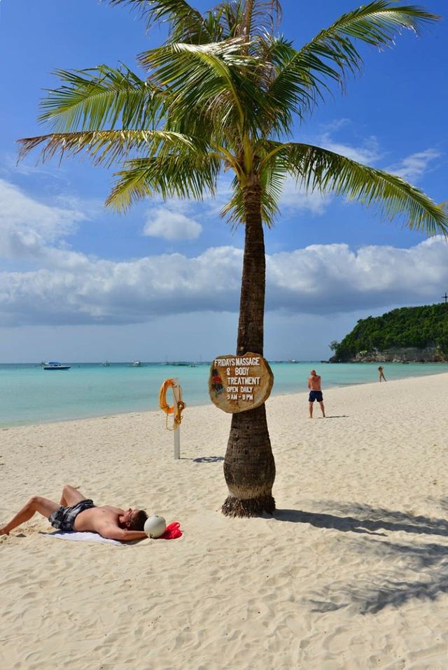 星期五海滩是长滩岛有名的美丽白色沙滩地段,位于星期五度假村内,这里沙质细柔,当地人称为“粉末沙”(Powder Sand),发挥艺术的想象力,在沙滩上堆个城堡,或悠闲躺在椰林沙滩下,享受海天一色、哪怕仅是漫步在美丽宁静的白色沙滩上,看夕阳西下,也别有一番意境。
