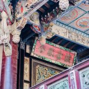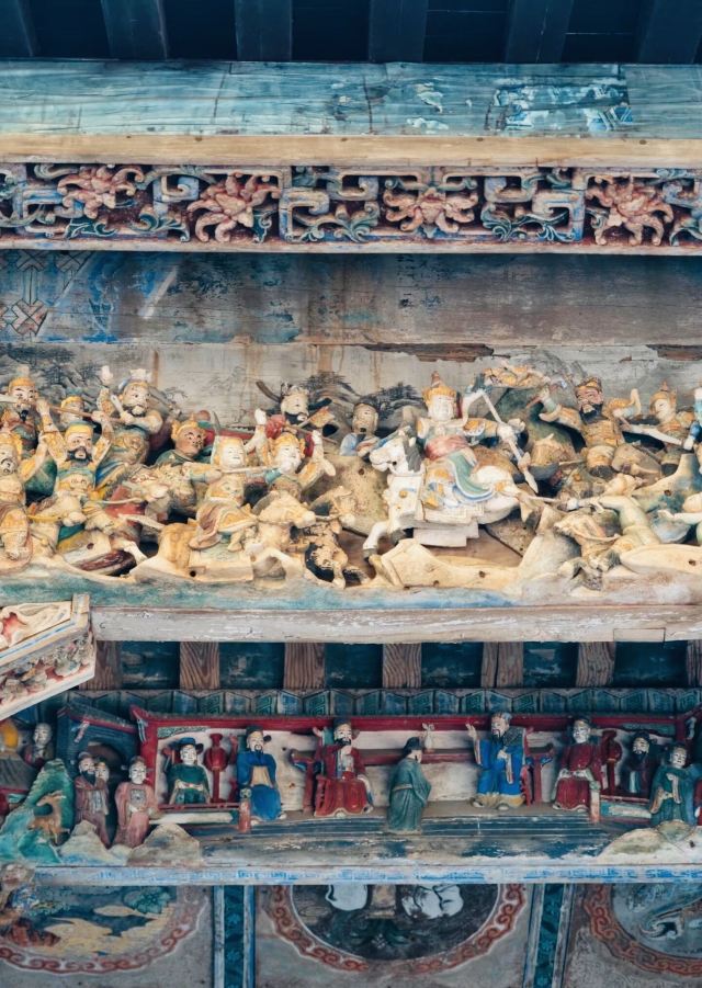 ❸ 木雕戏台:藻井彩绘已斑驳,但鎏金雀替依然闪耀,想象当年徽商云集,台上唱尽悲欢离合