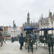 布鲁日大广场位于布鲁日古城中,广场矗立着14世纪奋起反抗法国的“金马刺之战”的英雄雕像,南侧是布鲁日标志性建筑,东侧是哥特式的大楼和邮局,北侧和西侧为各式餐厅和礼品店。广场上有马车可以付费乘坐,带你穿梭在布鲁日的大街小巷。