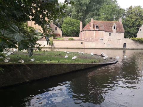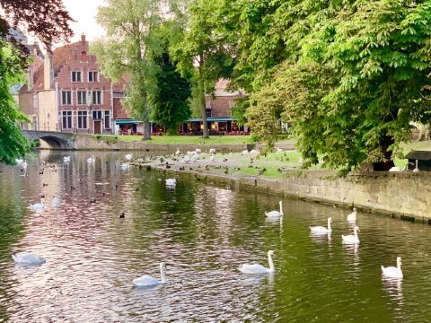 爱之湖位于布鲁日市中心大约一公里距离的地方,整个爱之湖公园还挺大的,有点小镇的味道,逛一圈大概需要1个小时的样子,也可以选择在这里吃个午饭,喝个下午茶,欣赏一下美景。爱之湖是一条狭长的湖泊,周围环境非常优美,到达的时候阳光☀️正好,洒在湖面上,如油画一般。湖水清澈,两边建筑倒映在湖中,有一种田园风光的意境。