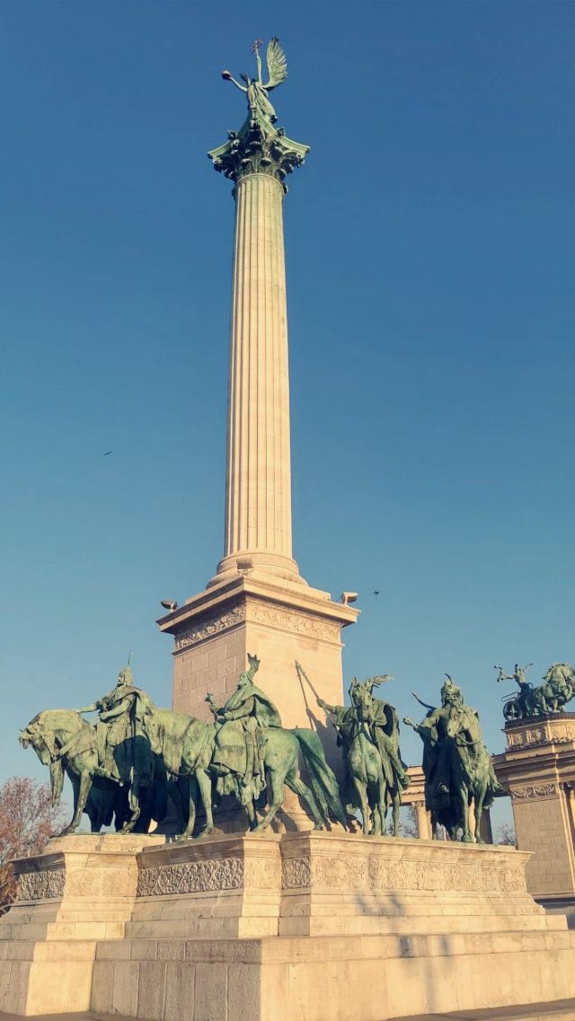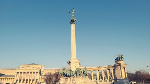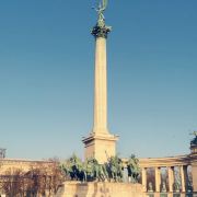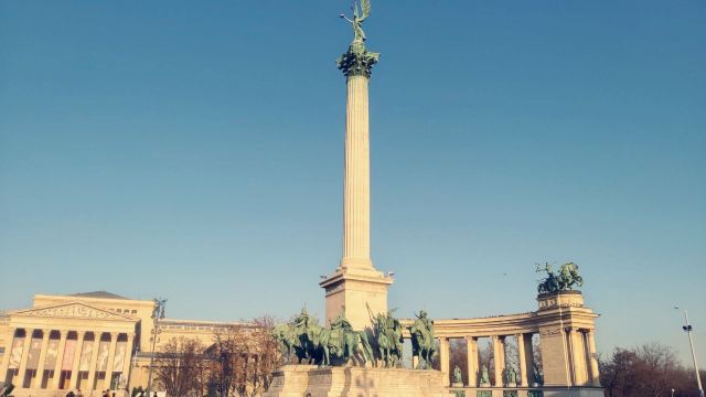 漫步英雄广场,可以先驻足欣赏广场上精美的建筑。广场中心矗立着高达35米的千年纪念碑,顶端是大加百利天使雕像,加百列手持加冕王冠,驱车前行,威风凛凛。纪念碑的底座上有七座匈牙利祖先马扎尔民族部落首领的雕像。纪念碑的后方环绕着对称廊柱建筑,廊柱间并列放着14尊青铜像,他们当中有匈牙利的历代国王,也有为独立战争做出巨大贡献的王侯将相。