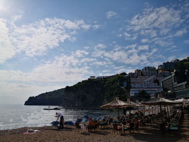 4分 满意在布德瓦老城的沙滩上喝咖啡,一个老外突然跑过