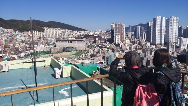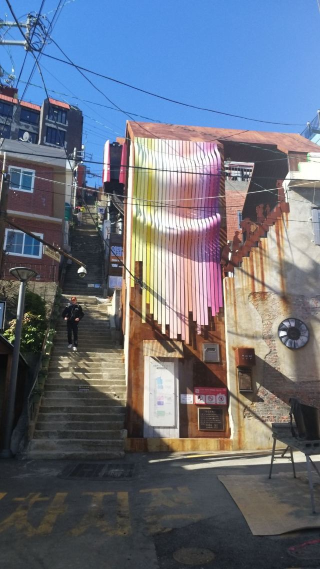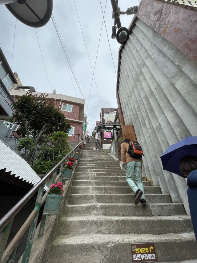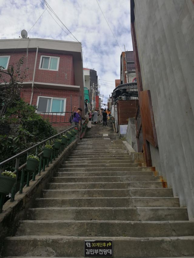 台阶的两侧装饰着色彩斑斓的壁画,展示了釜山的历史和居民的生活场景,为游客提供了丰富的视觉体验。沿着台阶拾级而上,游客可以在不同的角度欣赏到釜山的城市风光,尤其是在日落时分,景色尤为迷人。