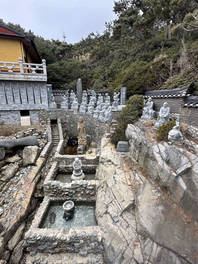 现存的建筑物以大雄殿为主,另外还有窟法堂、龙王堂(龙宫坛)、梵钟阁、寮舍寨等,大雄殿为住持晸庵于1970年代重建。大雄殿前的窟法堂被称为弥勒殿,供奉着从寺院创建起就存在的弥勒坐像石佛,有许多没有子嗣的信徒们前来求子,因此又被称为得男佛。大雄殿前有四狮子三层石塔,原本这个位置有着高3公尺的岩石(弥勒岩),壬辰倭乱时寺院成了废墟,韩战时为了建造海岸警备网而将其破坏。1990年,住持晸庵收集了被破坏的石头,用来补强损伤的庵壁,并建筑了这座石塔,供奉着从斯里兰卡带回来的7块佛舍利。除此之外,寺里还有以单一石材建成的韩国最大石像──高约10m的海水观音大佛,又被称为东海笠岩