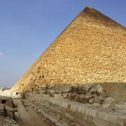 哈夫拉金字塔是埃及第四王朝法老-哈夫拉建造的金字塔,在它初建成时,也就是公元前26世纪中叶,有143.5米高,只比胡夫金字塔矮三米。边长215.5米,是吉萨金字塔群中第二高、第二大的金字塔,它现在高136.4米,塔壁倾斜度为53度10分,比胡夫金字塔更陡,而且它所处的基岩比胡夫金字塔的要高十米,因此它看上去比胡夫金字塔还要高。哈夫拉金字塔前设有祭庙,庙前长长的地道通向另一座河谷的神庙,和狮身人面像。