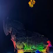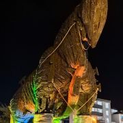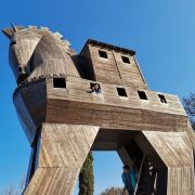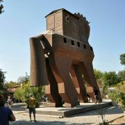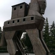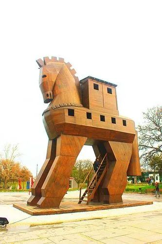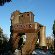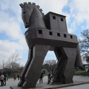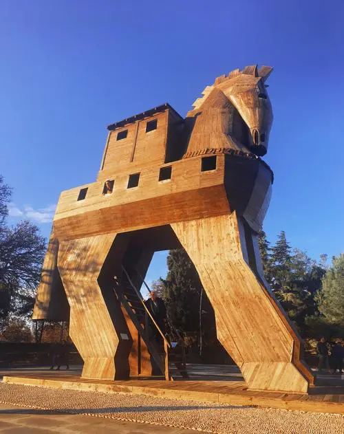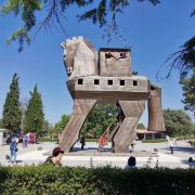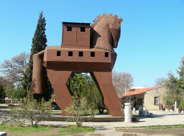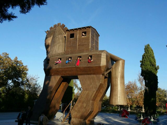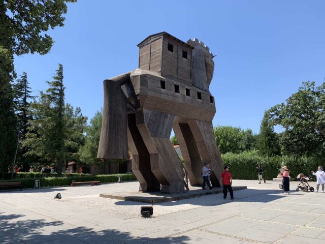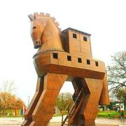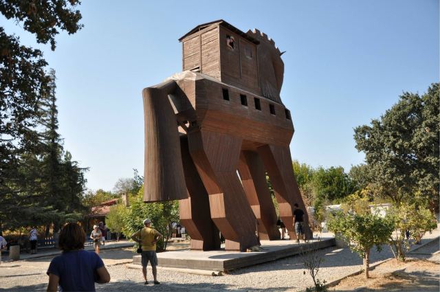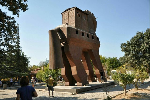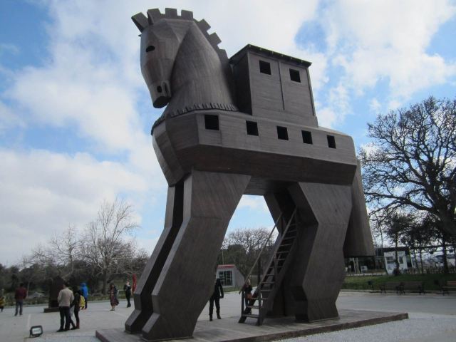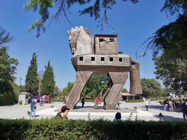 特洛伊纪念像在海港东边的散步道上,是一只硕大的特洛伊木马(Trojan Horse),它和人们在电影《特洛伊》中看到的木马大小一致。木马下面有那座古老城池的模型和一些相关介绍信息。