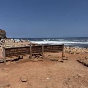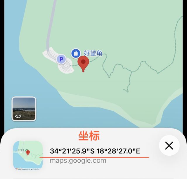 走到海滩另一头,这里有一块长条金色标志纪念牌,半人高的纪念牌由三块拼接而成,左边是英文,右边是阿菲力康文,也就是南非荷兰语,而中间则是好望角准确的经纬度18°28'26"E,34°21'25"S。这里也是每一个来好望角游客合影留念的地方,你不妨也在此拍张照,证明自己到过这里。