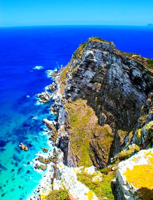 站在山顶除了一览迷人的海景外,还可以眺望不远处的好望角。好望角是大西洋寒流和印度洋暖流的分界,你可以看到海上有一处明显的浅蓝与深蓝色的分界线,在你的左手边是印度洋,右手边是大西洋。看过两大洋的分界线后,绕过灯塔还可以继续往前走,此时你不妨回头再看一眼开普角山顶的景象,会发现它异常的雄伟壮观。