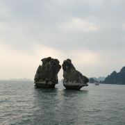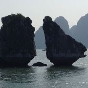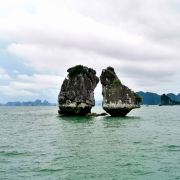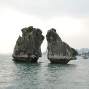5分 超棒斗鸡石位于木头岛的南面距香炉石约800米。两块约12米高的小石山,好像一对展翅的大鸡由一条狭窄的海沟分隔而面对面站立着。两块石山被选为下龙湾最独特的形象。斗鸡石于2000年被选为越南旅游业的标志。