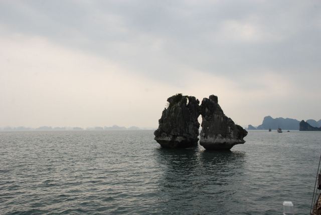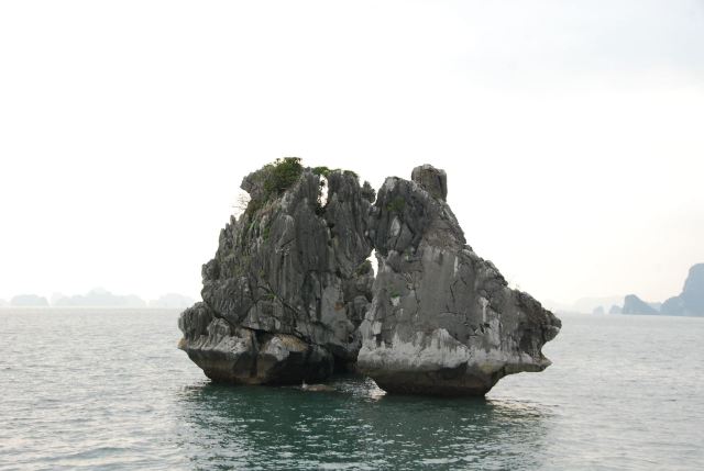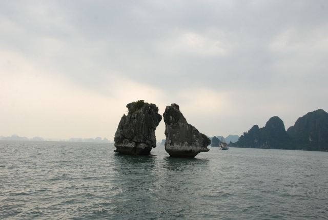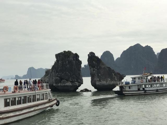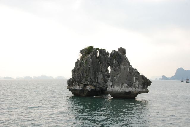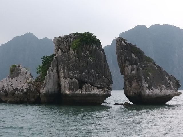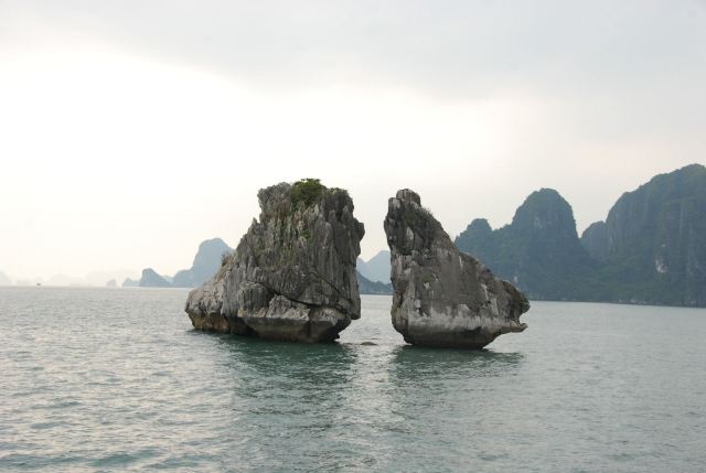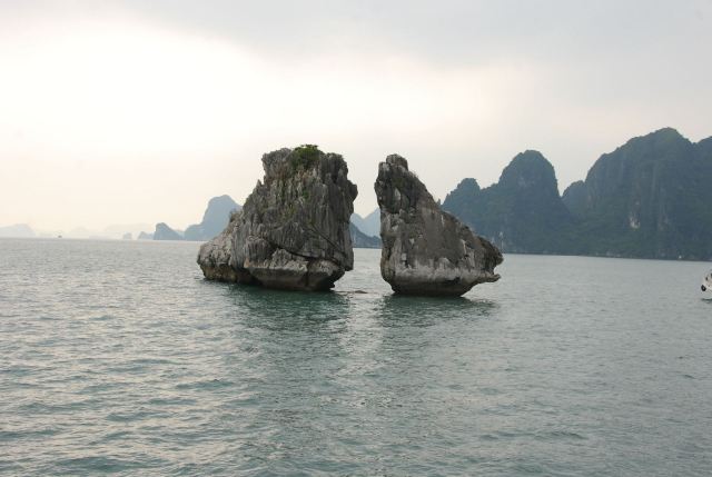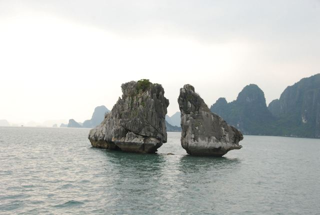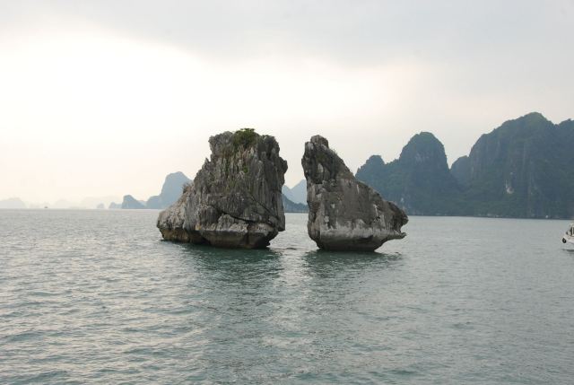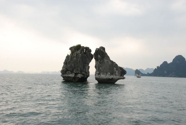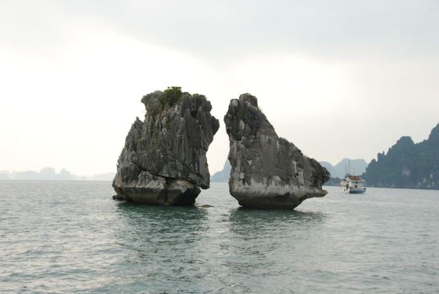 下龙湾奇形怪状的岛屿很多,但它的典型标志就是斗鸡石。所谓“斗鸡石”,就是两座邻近的小岛,造型奇特,形状犹如两只面对面的斗鸡。它俩怒目相视,嘴角相向,好像随时准备腾跃而起,展开一场惨烈的决斗。