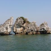 5分 超棒坐在游船上慢慢观看这些典型的喀斯特地貌的小岛,感觉就像是在看我们广西的“海上桂林”。有些礁石经过若干年的风吹雨打形成了各种各样的造型,其中最有特色的就是这快斗鸡石,真的很形象!
