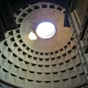 主体建筑结构简洁明了,是一个宽度与高度相等的巨大圆柱体,上面覆盖着半圆形的穹顶。内部没有窗户,四周一圈围绕着诸神雕塑。顶部有一个直径8.9米的圆形大洞,是万神殿的采光点,光线从顶部泄下,并随着太阳位置的移动而改变光线的角度,给人一种神圣庄严的感觉。