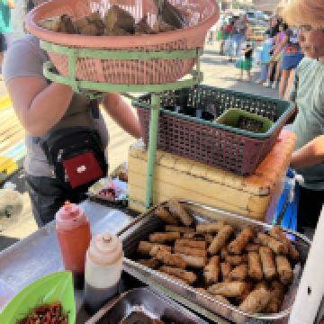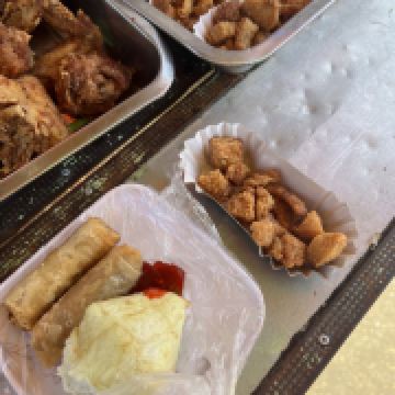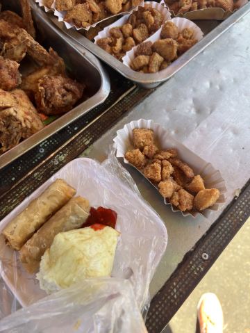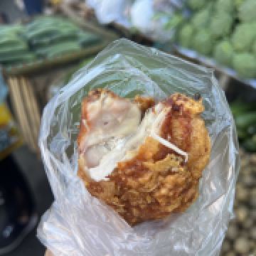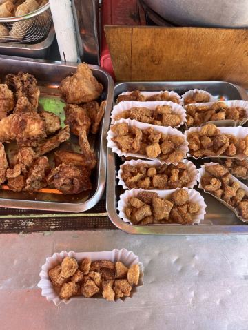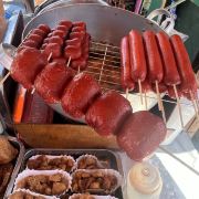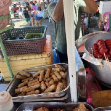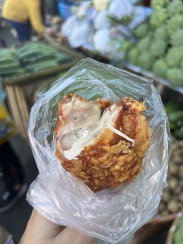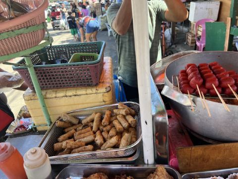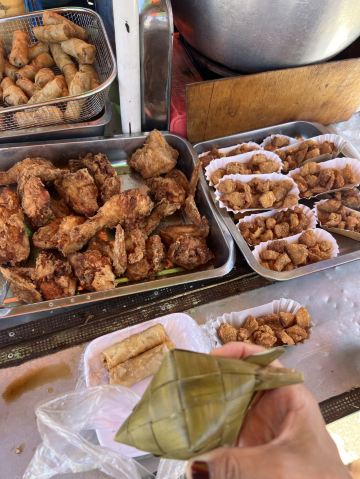 我最感兴趣的是市场外面的路边摊美食。油炸鸡腿、鸡块、猪皮、春卷等,还有像粽子一样的饭里面包的是糯米,蘸上他们自己的辣椒酱很好吃。肉肠看起来红彤彤的有点吓人,但是来都来了就尝尝,就是有点太咸其他都好。有跟我一样喜欢光接地气市场的一定要来逛逛。