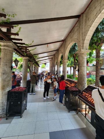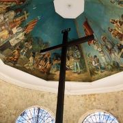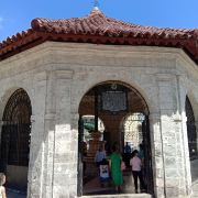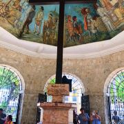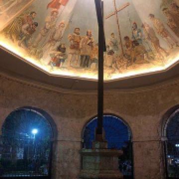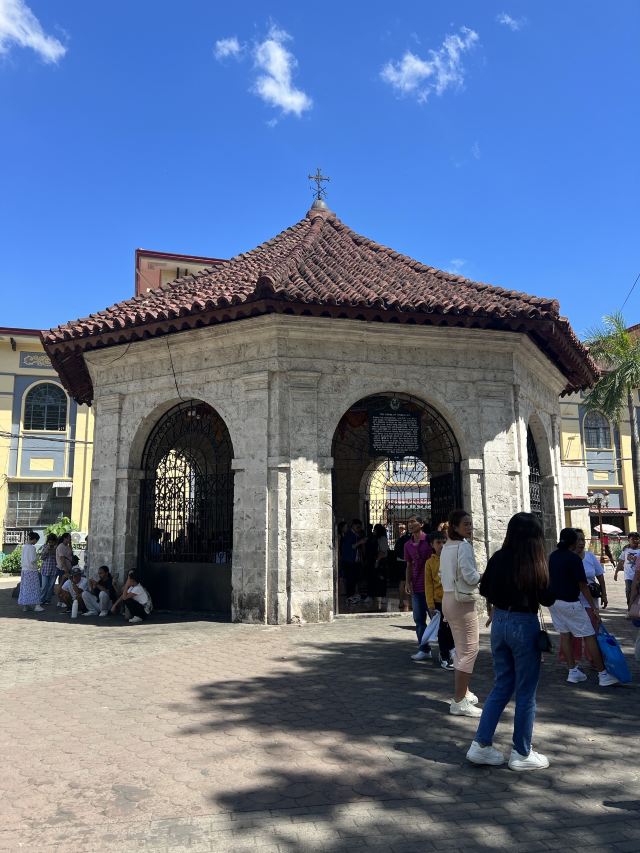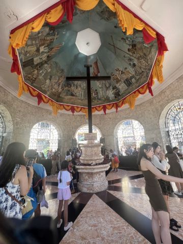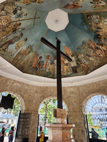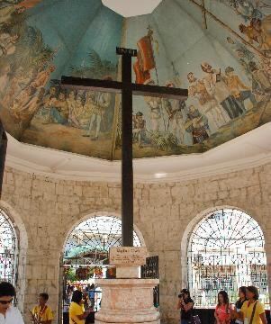 ·建筑特色:十字架被安置在一个六角型亭子里,亭子的天花板壁画保留着当年麦哲伦登陆宿务岛时,随船神父为第一批菲律宾天主教徒举行施洗仪式传教的场景,色彩艳丽逼真。