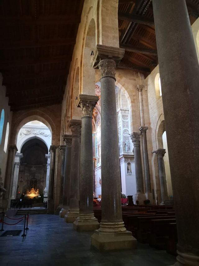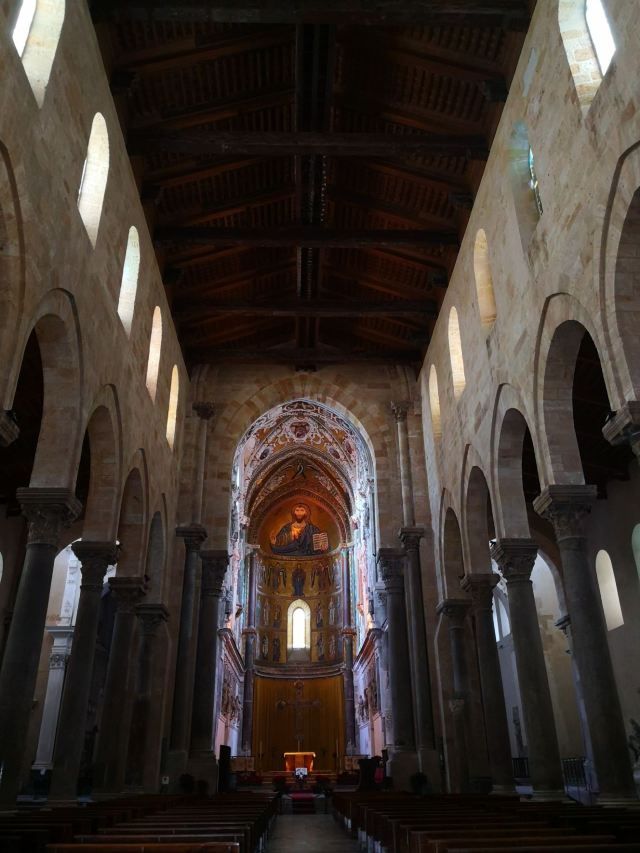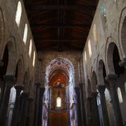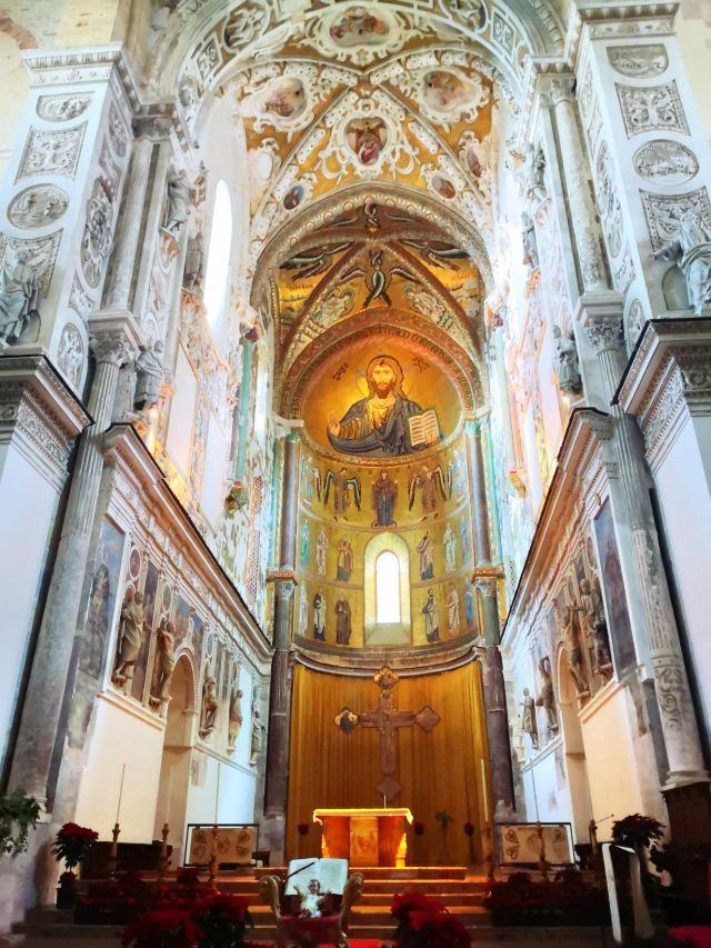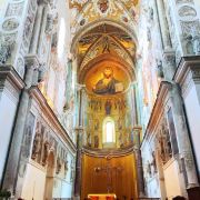 切法卢主教座堂位于意大利西西里岛的切法卢镇,作为诺曼风格的代表作之一,这座大教堂是艺术和建筑爱好者的必访之地。教堂的外观以其雄伟的双塔和坚固的石墙而著称,这种设计体现了防御工事的功能。进入教堂内部,游客会被其壮丽的拜占庭风格马赛克所吸引,尤其是祭坛上方的基督全能者马赛克,这幅作品以其精美的工艺和丰富的色彩而闻名,是拜占庭艺术的杰出代表。教堂的内部结构为三廊式设计,宽敞的中殿和两侧的侧廊由一系列优雅的柱子分隔,柱头上装饰着精美的雕刻。教堂的穹顶和墙壁上也装饰着大量的壁画和雕刻,这些艺术作品展示了高超的技艺。