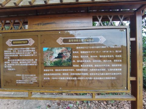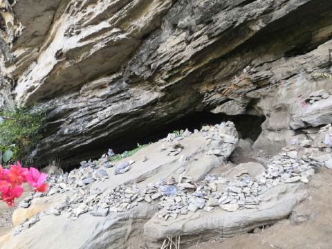 在石景后面有“皇宫”,门口有三片横石,像挂的彩锦,门后有一石柱,柱身上雕龙绘凤。宫顶上有一通天洞口,长2米,宽1.5米,像天窗,光线照射下来,使洞里光彩夺目。攀登着石阶可以从天窗外爬上洞顶,观赏四周的群山、稻田以及黎族村寨。