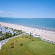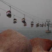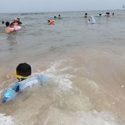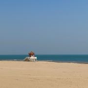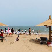 美丽的黄金海岸风景区位于渤海岸边,海岸线全长约52.1公里,具有沙细,滩软,水清,潮平的特点,是进行海水浴、阳光浴、沙浴、森林浴、空气浴的理想地点。该景区比较吸引人的运动就是滑沙了,游客可先乘坐索道缆车直达沙顶,沿途只见一道道沙山连绵不断,风光独特,坐在竹木制成的滑沙板上,从几十米高的沙山上呼啸而下,速度也越来越快,冲到平地后由于惯性的作用,还会继续向前滑出几十米远,感觉既新鲜刺激又安全可靠。
