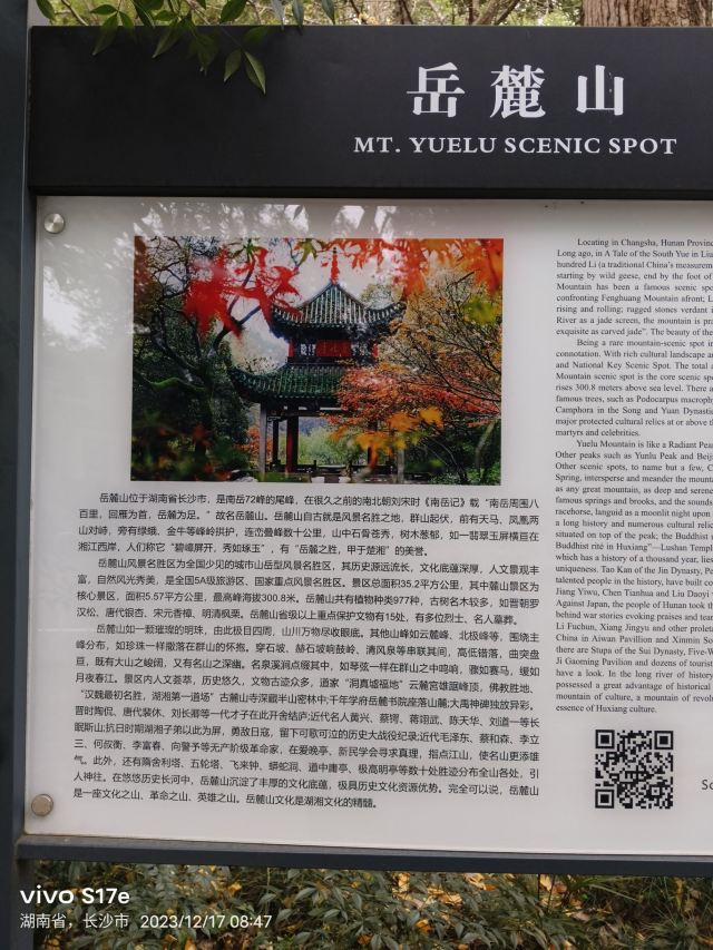 1、观光长廊位于5A景区岳麓山•橘子洲旅游区内,该景区位于长沙市的核心区域,分岳麓山和橘子洲2大区域组成。岳麓山是长沙市市区西侧的历史名山,占地约5.57平方公里,东临湘江,是南岳72峰的尾峰,最高峰禹王峰海拔300.8米,山上树林碧翠、人文古迹密集,是集健身养生、观景摄影、古风摄影、徒步探险于一体的登山类景区,历史上留有的名人足迹数不胜数。岳麓山分穿石坡湖、祥云阁、古麓山寺、云麓宫、爱晚亭、岳麓书院、东门7大区域。