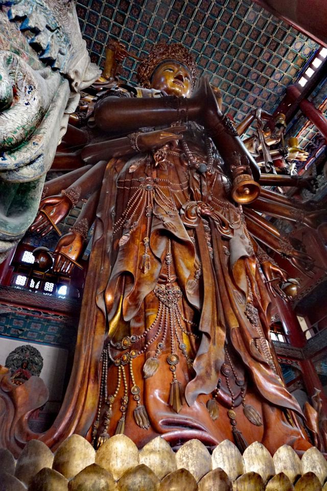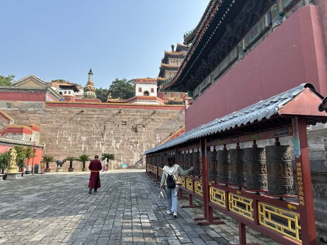 进入寺内可以在各个殿祈福,一般需要付几十元左右的香火费用。寺内很值得进入一看的是位于后院正中普宁寺-大乘之阁内的千手千眼观音,观音像高约三十多米,是世界上较大的木雕佛像,特别珍贵和壮观,一定要进入参观、参拜。