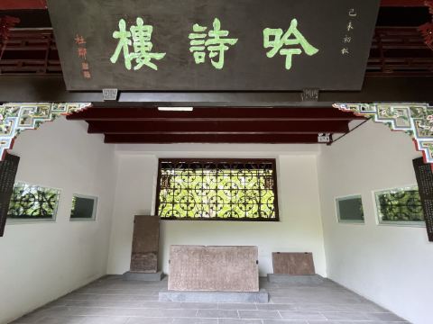 吟诗楼为砖木结构建筑,一楼三叠,翘角飞檐,四面敞轩,依江而立,玲珑秀巧,风格别致,颇具江南庭园风韵。