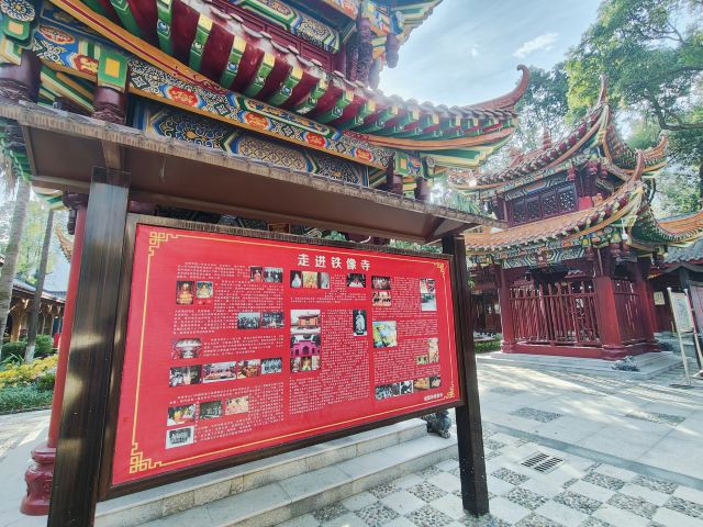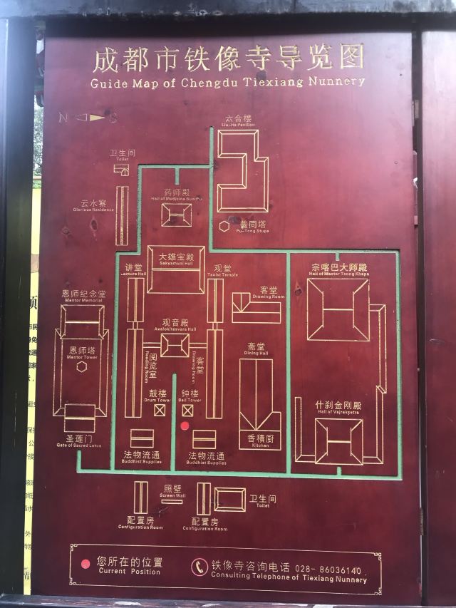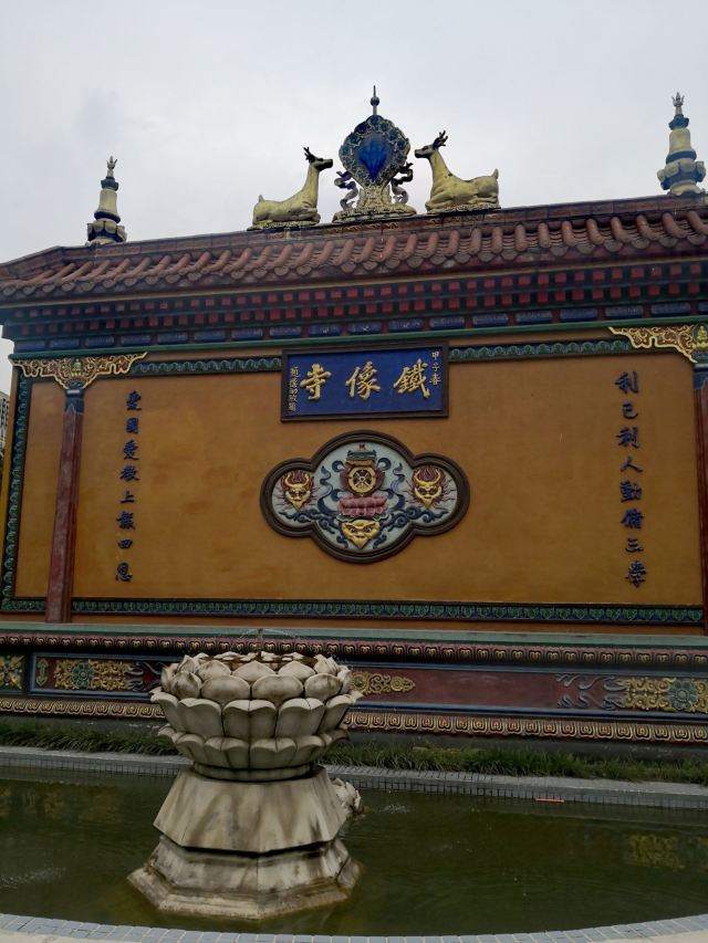 铁像寺山门的匾额是中国佛教协会会长赵朴初题写的。院内殿堂巍峨,草木葱郁,屋舍俨然,清新雅静,安宁祥和。整个建筑既独立成院,又浑然一体。一进山门便能看见雄伟的观音殿,殿内供奉一座金丝楠木慈悲庄严的观世音菩萨坐像,观世音菩萨救苦救难在大千世界深受各类众生的敬仰。第二重大雄宝殿系明代建筑,保存了繁复的窗花。成都经过明末战乱,明朝寺庙保存者甚少,这也算硕果仅存了。宝殿内佛像以铁铸释迦牟尼为主尊,左为文殊菩萨,手持经书及慧剑,右为弥勒菩萨,手持宝瓶及法轮。藏传佛教以文殊菩萨为深观(空宗)传承之首,以弥勒菩萨为广行(有宗)传承之首,辅翼释迦牟尼,称为二大车,代表释迦牟尼一代时教。此种造像布局,亦为汉地寺院所无。大雄宝殿后为藏经楼,琉璃瓦屋顶,以法轮双鹿为脊,仿藏传建筑风格,后又逐步建了大觉堂,普同塔、观音阁等。