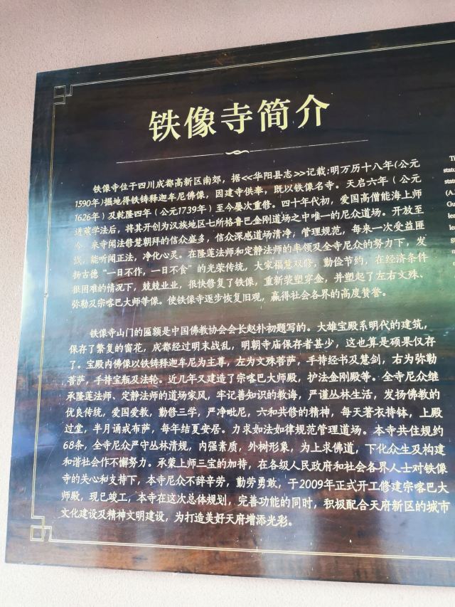 铁像寺位于成都市高新区南郊,明代万历十八年(公元1590)掘地得铁铸释迦牟尼佛像,因建寺供奉,即以铁像名寺。天启六年(公元1626年)及乾隆四年(公元1739年)屡次重修。四十年代,由爱国高僧能海上师进藏学法后开创为汉族地区(简称汉地)七个金刚道场之中的尼众道场。