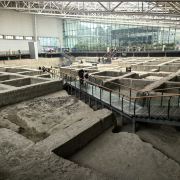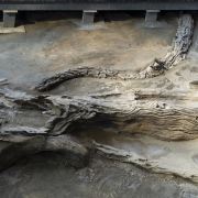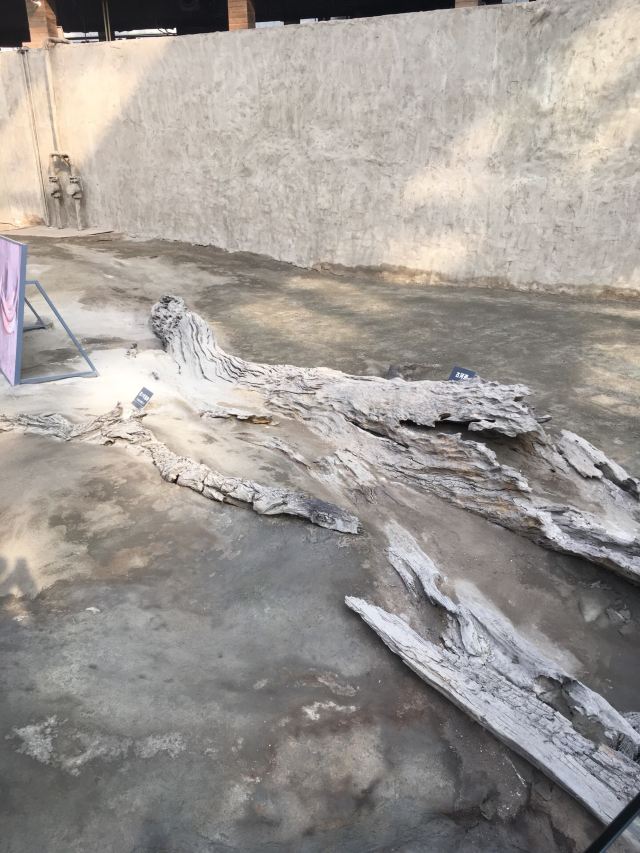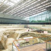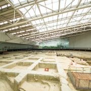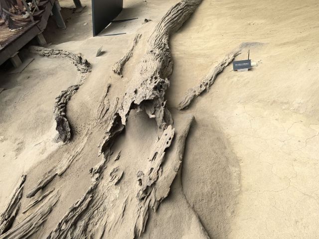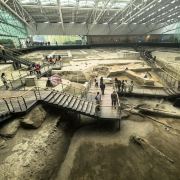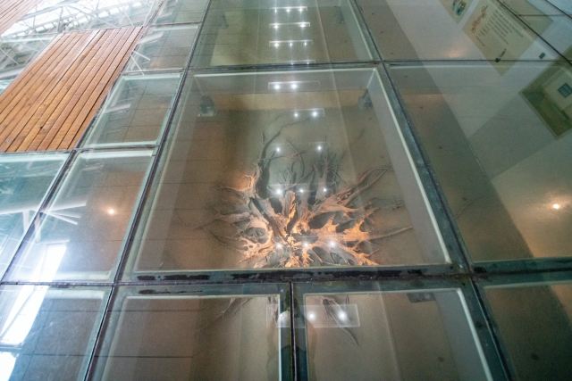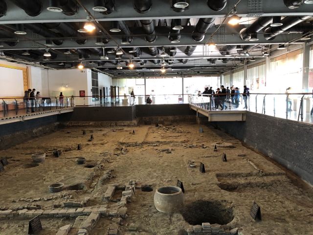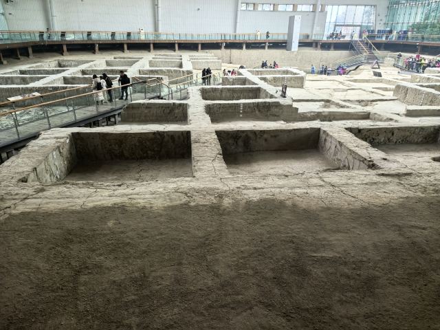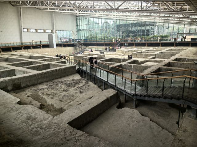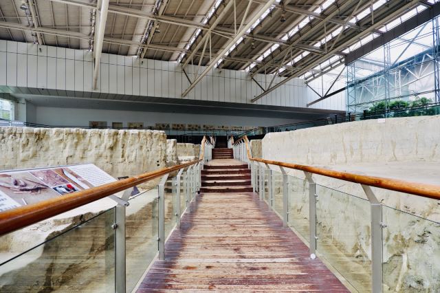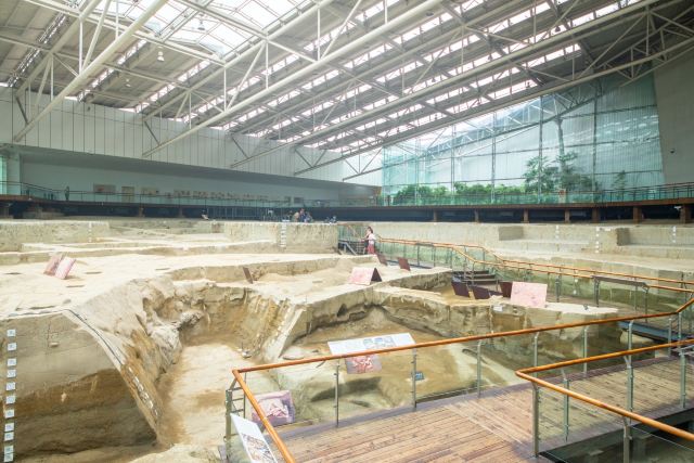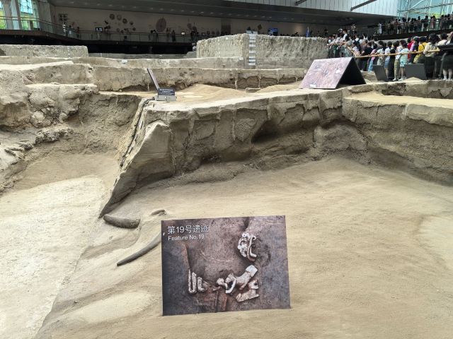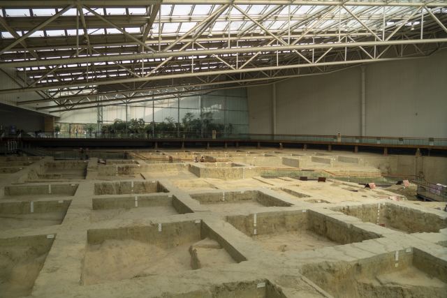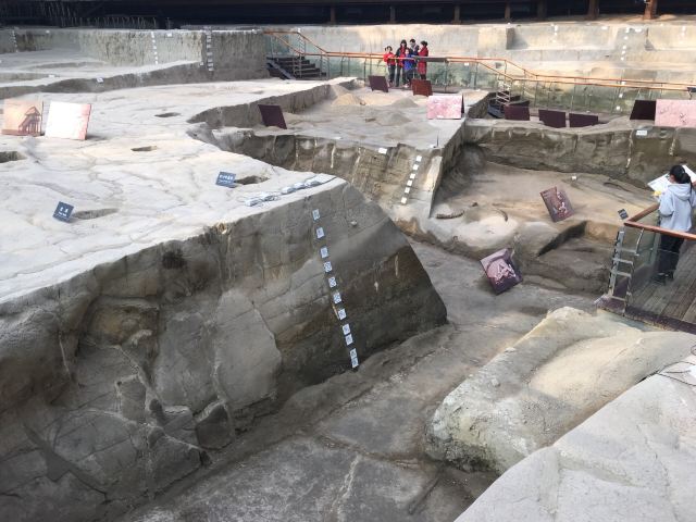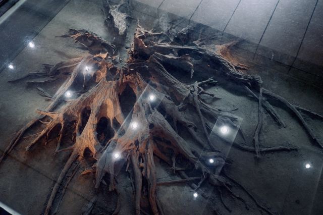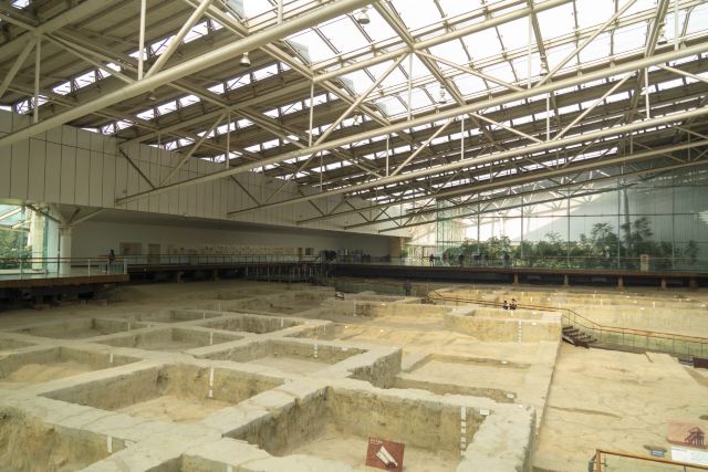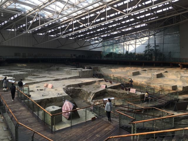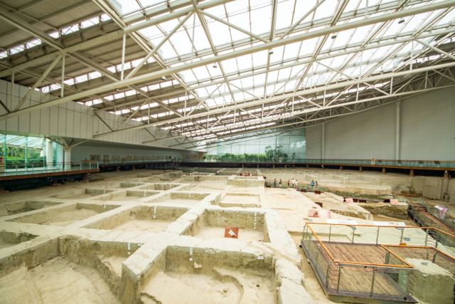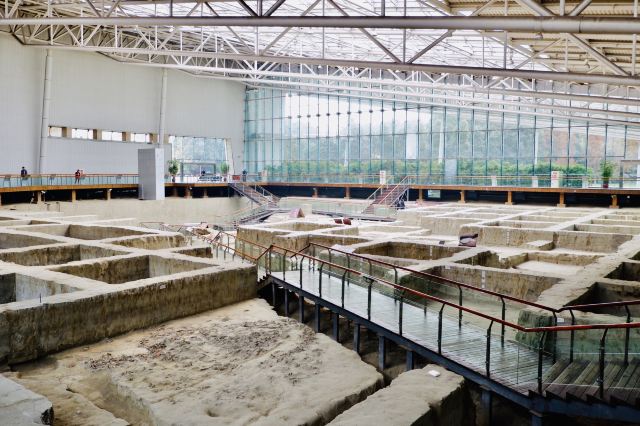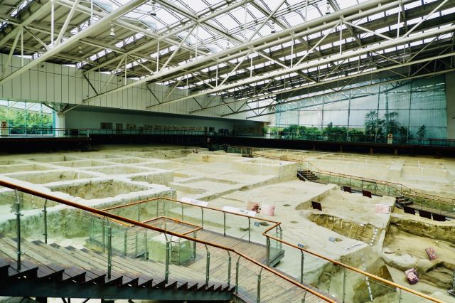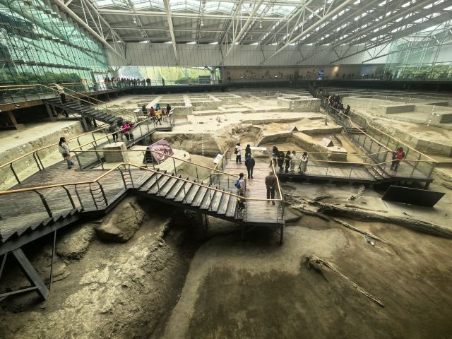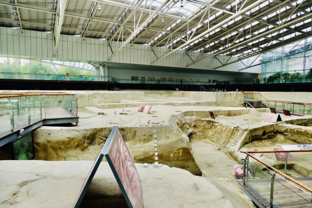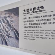 遗迹馆内是金沙遗址大型祭祀场所的发掘地,原生态展示了发掘现场、大型树根遗迹等。既保持了历史遗存本体的完整性与真实性,也为刚刚走进金沙遗址的观众带来了视觉上的震撼。在这里,观众一方面可以实地感受3000年前古蜀王国祭祀活动的宏大气派,另一方面又能身临其境,近距离观看考古发掘现场,了解考古发掘的工作原理。
