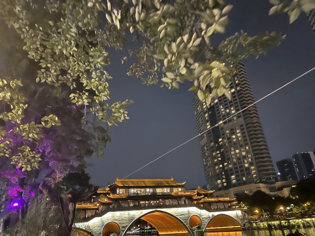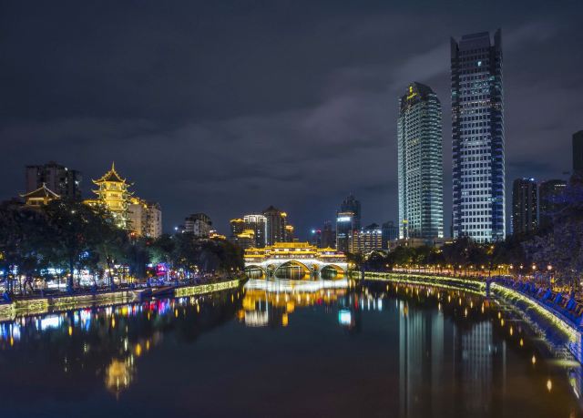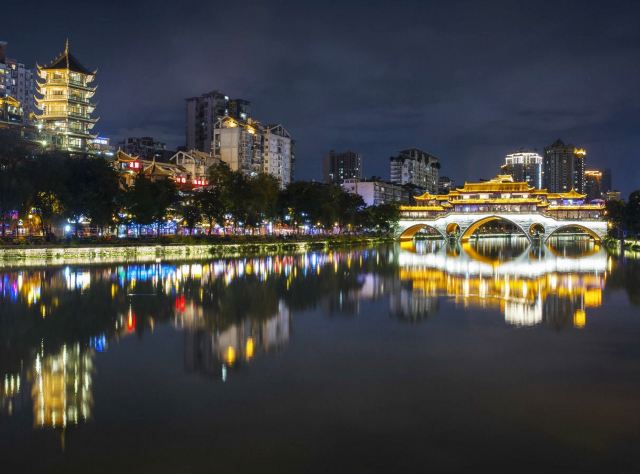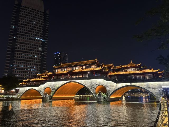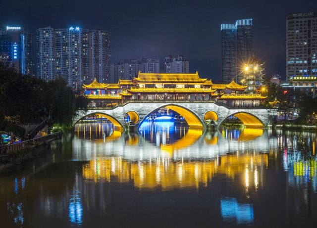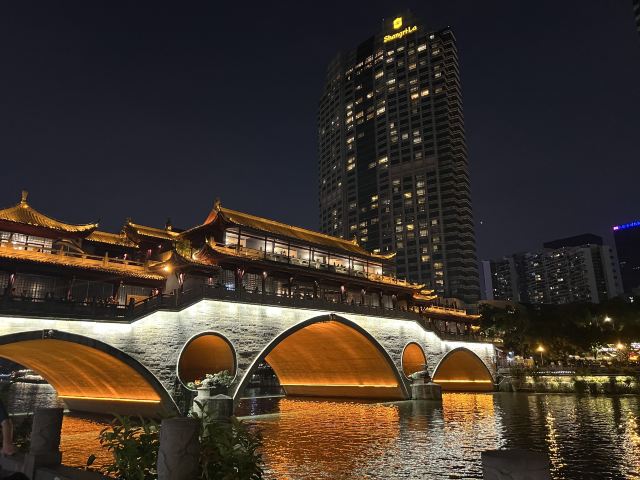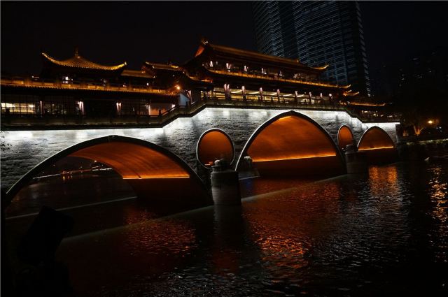 安顺廊桥有着悠久的历史,最初的建筑踪迹可以追溯到元代。在马可•波罗的游记中,安顺廊桥是他印象中较为深刻的四座大桥之一。现在看到的是在2003年设计修建的了,得以恢复其大致的原貌。由于安顺廊桥的夜景非常美丽,也曾经出现在成都的城市旅游宣传片中,频繁地出现在大众的视野中,名气和熟悉度也远远高于九眼桥,也让很多人因此去安顺廊桥打卡拍照,欣赏这令人沉醉的夜景风光。一到夜晚,桥上的霓虹灯光亮起,整座桥就成为河上最耀眼的风景。明代风格的廊桥在暖黄色灯光的映照下显得别有韵味,彰显出了成都这座历史文化名城的浓郁内涵。半圆形的桥洞与水中的倒影相互映衬,组合形成了一个完整的椭圆,好似模糊了虚与实的界限。