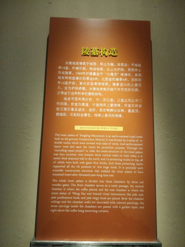 中国古代墓葬是非常注重,帝王更是重视墓葬的选址与修建。戎战一生的王建称帝时已过不惑之年,随即由著名文士曾任“成都尹”的周庠主持选址与修建工程。永陵选址成都城的西北方,距离当时的大西门外不到一公里,为一处高于城内的台地。据史料记载永陵修建时曾请当时的著名画师赵德齐与擅画佛像的高道兴曾在陵庙中绘壁画100余堵,可以想见永陵的恢弘气势。918年,享年71岁的王建久病后死于痢疾,归葬永陵。