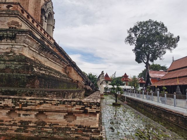 契迪龙寺是另一处神圣的寺庙,位于古城的核心区域。寺中较有名的是一座恢弘的四方形兰纳式佛塔,四面雕刻着精致的护塔灵蛇。
