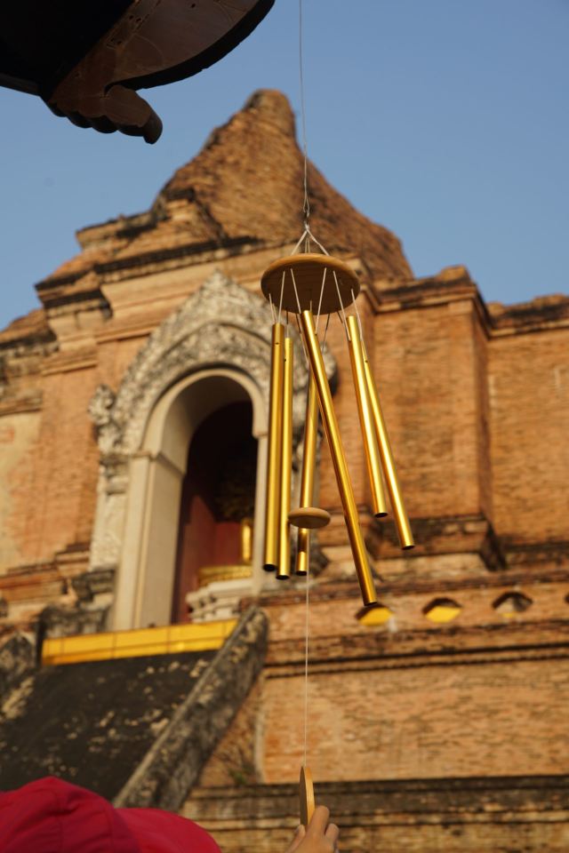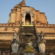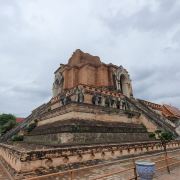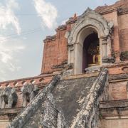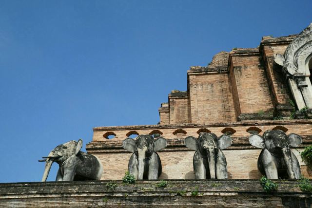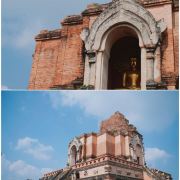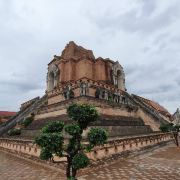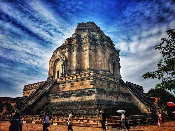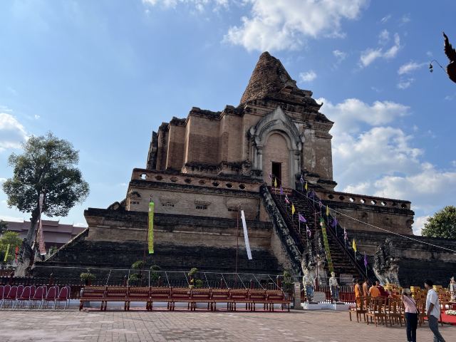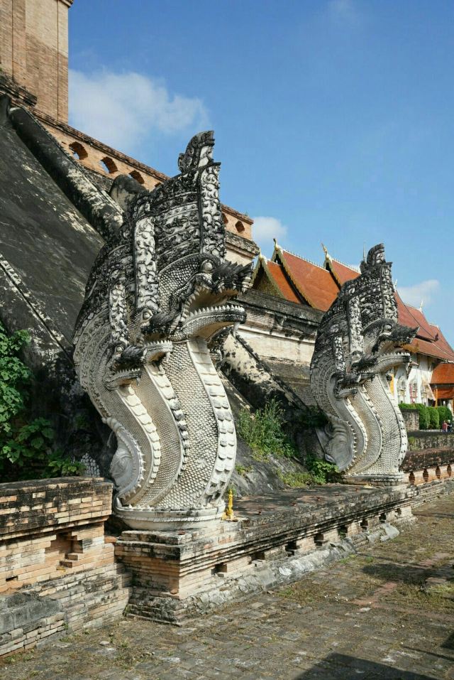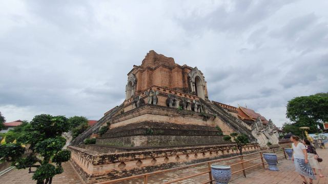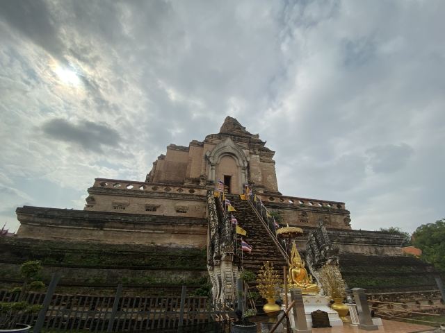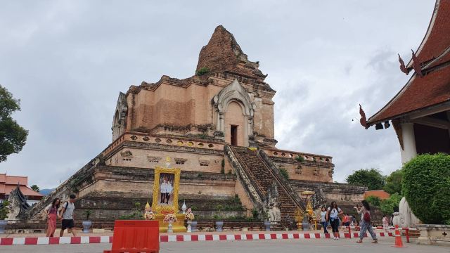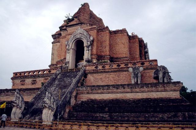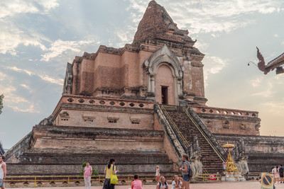 走进去之后,你就可以看到大佛塔,这座四方形兰纳式神圣佛塔建于1411年,高近80米。据说16世纪清迈发生一次大地震,佛塔的尖顶一夜之间塌毁。联合国教科文组织和日本政府曾出资重建佛塔,但尖顶却没法完成,因为没人确切知道原先佛的上部结构是什么模样,所以现在所见的是平顶的佛塔。