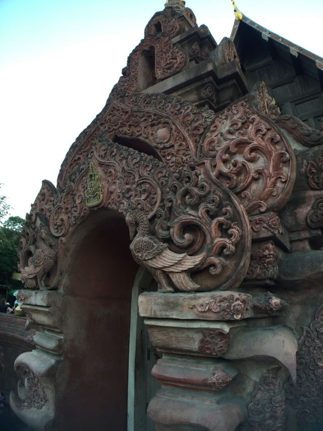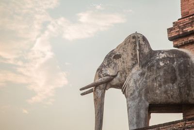 佛塔的四面雕有精致的护塔灵蛇,蛇身则随着阶梯而上,但这些也是后来修复重建的。塔身上有六座大象雕塑,原来的大象雕塑大多已毁坏,现在其中五座是重新雕刻的水泥制品,右方的一座缺了耳朵和象鼻的是保留下来的原作,有兴趣的可以仔细看一下。