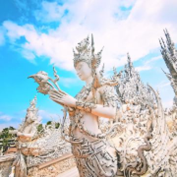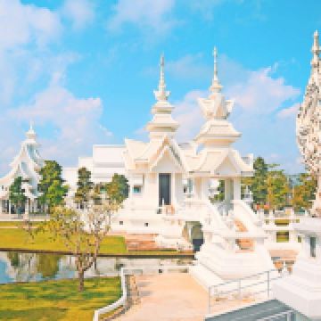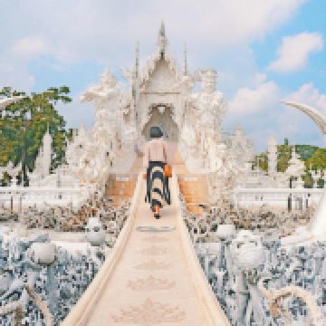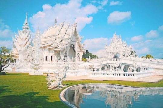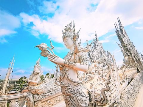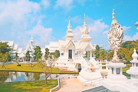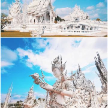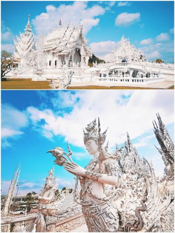 5分 超棒白庙是位于泰国清莱府,清莱距离泰北的中心城市清迈180公里,被人们称为“世界上最纯洁的一方净土”。来这里可以安排清莱一日游,主要的景点可以参观白庙、黑庙还有著名的金三角的三国交界处。建议人多的可以自己包车来,时间比较宽松。白庙的开放时间:8点-17点,中午12点休息。免费进内参观。白庙其实不大,大概半小时内就能走完,但如果想慢慢拍照,还是要花费一些时间的。白庙真正的英文名叫Wat Rong Khun,是当代非传统的佛教和印度教寺庙。这里从1997年开始建设,但还没建设完工喔,预计要2070年才能全部完成。在泰国大部分的寺庙都是色彩斑斓,金黄灿灿为主的,但我更喜欢这纯白无瑕的白庙,躺在蓝天白云下熠熠生辉,洁白纯净,一尘不染,如坠落在凡间的白衣天使,太美了。