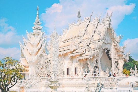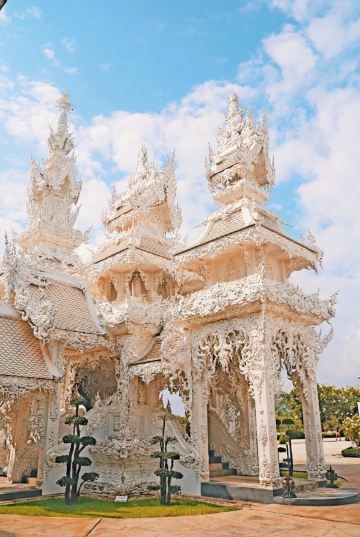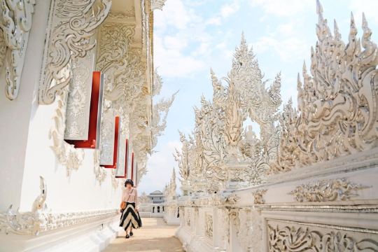 整座建筑以白色为主色调,由白色涂料和玻璃马赛克构建,至今尚未全部完成。阳光下炫目的白庙闪得人睁不开眼睛,只能用绝美来形容难怪是清莱的扛把子寺庙啊