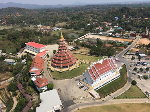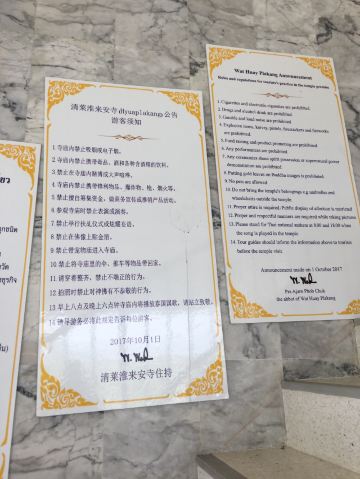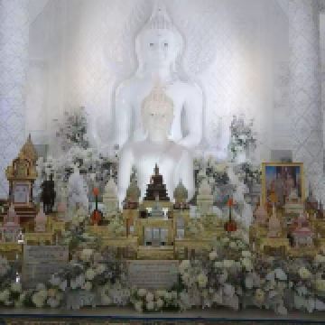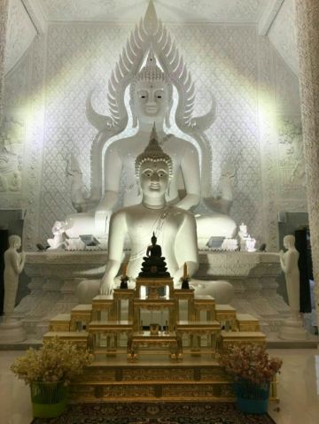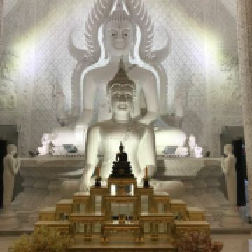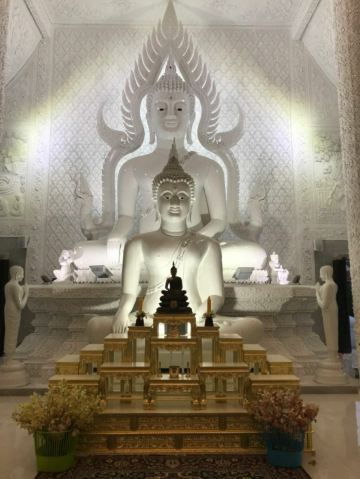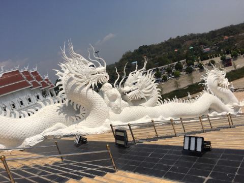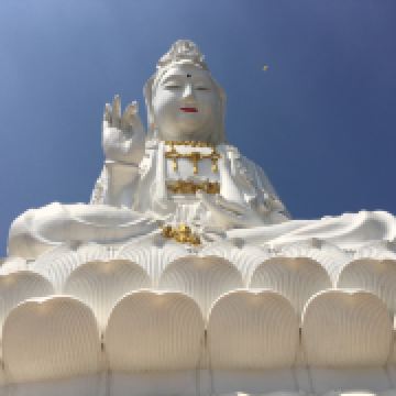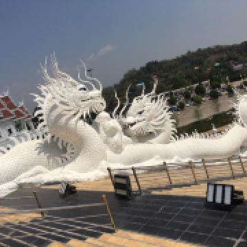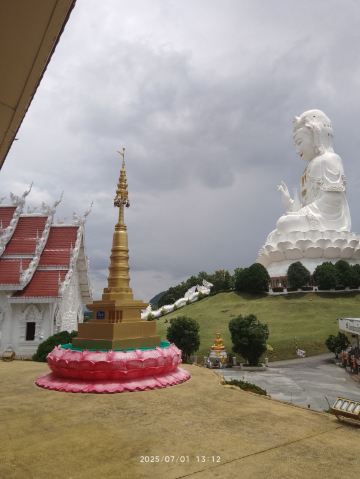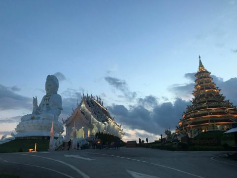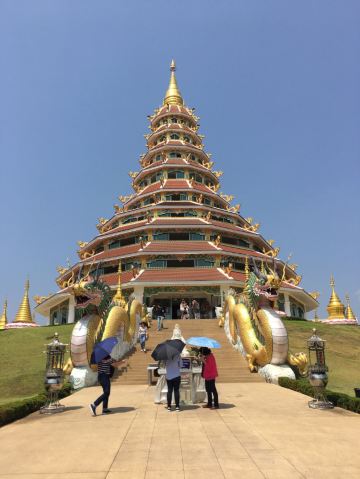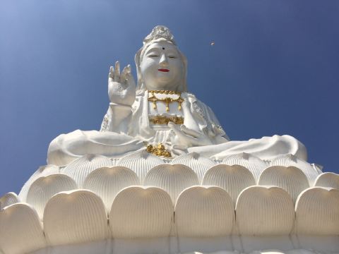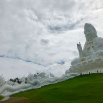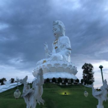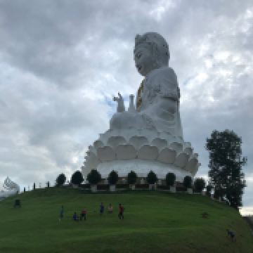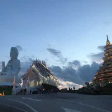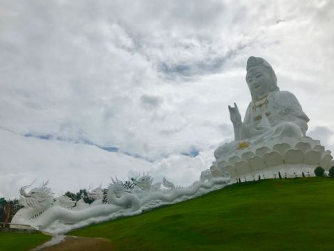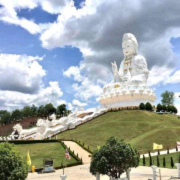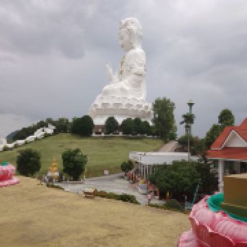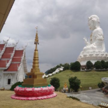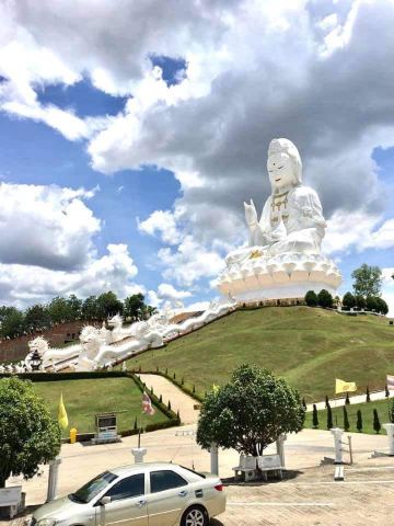 Wat Huai Pla Kung寺坐落在山上。这里主塔共有9层,通往九层塔的台阶两旁有两条中国龙,十分威严。里面有一个金黄的佛像,旁边还有童子站像,肃穆而安详。而主寺外面还建着一座巨大的白色莲花观音坐像以及雪白的小寺,很是引人注目。
