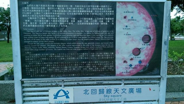 此地仅有地理标志之纪念碑,无其它观光设施,标志前林立着苍翠的龙柏,并有一座圆型方位仪,旅客常在此拍照留念。