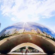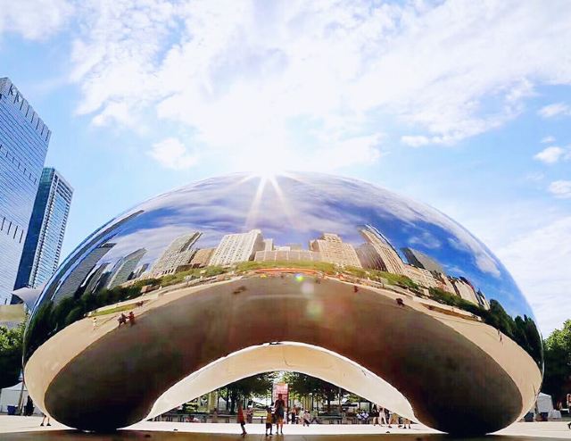 云门(CloudGate)--这是英国艺术家安尼施·卡普尔AnishKapoor在美国的首件公开户外作品,由完美抛光的不锈钢板构成,反射着芝加哥独特的都市景,也使它成了千禧公园最大的亮点,凡是来芝加哥旅游的游客都会在此留影。