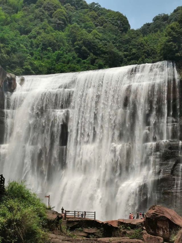 瀑布高76米宽80米,很壮观,是我国丹霞地貌上最大的瀑布,现在有点凉,雾水飞溅到身上,还是很凉的;
