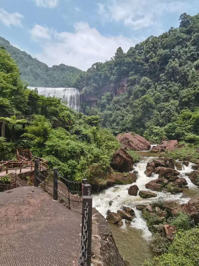 🌸简单概括景区就是由一条河两个瀑布,加上赤壁丹霞、栈道组成。两个瀑布即美人梳瀑布(中洞瀑布)、大瀑布(十丈洞瀑布)。