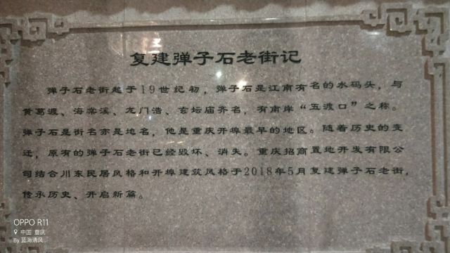 长嘉汇弹子石老街于2018年6月1日正式开街。曾是西南地区著名的水陆埠口,拥有法国水师兵营、王家大院等开埠文化根脉。传说大禹与涂山女结为眷侣,大禹治水期间,涂山女望夫化石,江石诞下儿子夏启,世人名此地为“诞子石”,后传作弹子石。后重庆名门望族王家在此兴办""万茂正盐号”,商贸云集,围绕王家大院形成繁荣街市,故得此名。