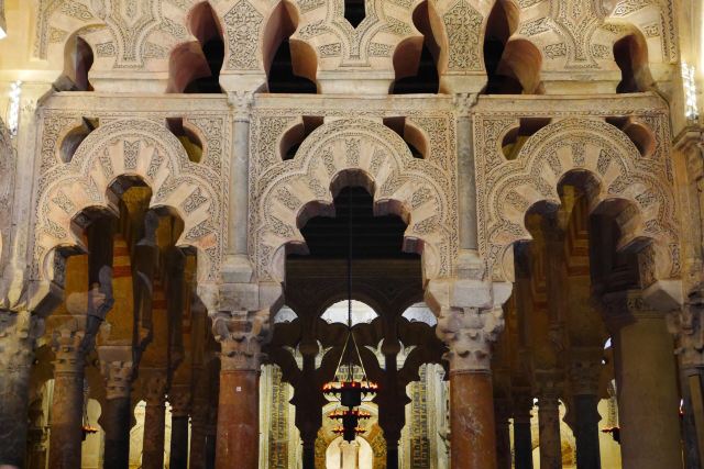 该寺的主要建筑——礼拜正殿十分雄伟,长、宽皆有百米,由850个马蹄形拱门组合而成的梦幻长廊十分华丽,拱顶鲜艳的红白相间线条,充满了异域的阿拉伯风情。组成拱门的柱子有3米高,顶端有两层重叠的马蹄形卷,用红砖和白云石交替砌成。半透光的设计使大殿更具神秘圣洁气息,石柱密布,步入其中仿佛置身于柱林。大殿内的圣龛上方装饰有层层叠叠的花瓣雕饰,十分精美,这里曾是国王礼拜处。