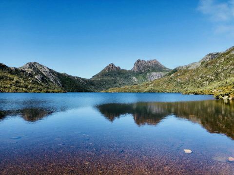 圣克莱尔湖国家公园是一处火山湖泊景观,位于知名的摇篮山的山脚下,与摇篮山遥相呼应。湖水是由于地震形成的堰塞湖,经过千万年的沉淀,湖水非常的清澈平静,就像是一面镜子一样,把摇篮山倒映其中,真的是美轮美奂。